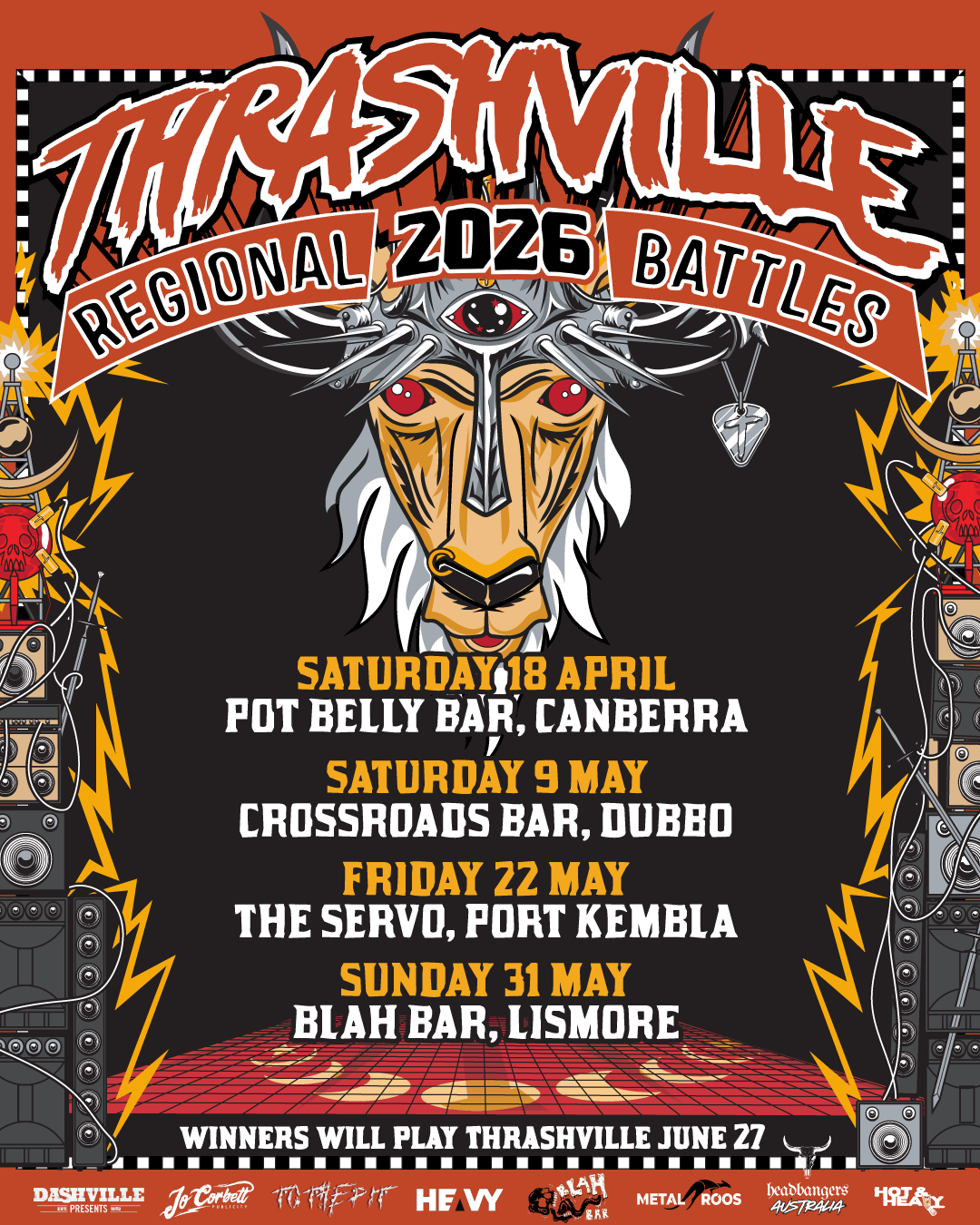 Thrashville Regional Battles return to cast a blazing spotlight on the some of the most fierce, hardworking and relentless bands lurking in this big brown lands often overlooked corners - where teeth are cut, blades sharpened and ferocious determination is forged.