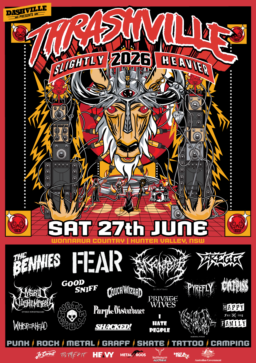 Thrashville, the ‘slightly heavier’ music festival held at Dashville in the Hunter Valley.